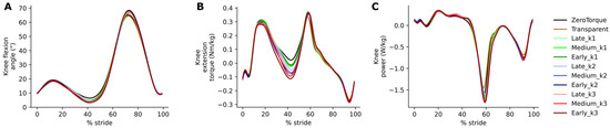 All graphs of recorded joint kinematics and kinetics for individual participants during the ZeroTorque and Early_k3 conditions are shown in Supplementary Figures S3 and S4 in Supplementary File S1.