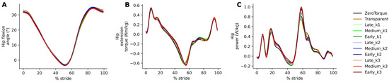 The hip joint appeared largely unaffected by the presence of AN-EXTRA-Push. Hip joint angle (Figure 5A) and torque (Figure 5B) trajectories remained stable across all conditions. RM ANOVA on hip torque integral reached statistical significance (F(10, 100) = 3.33, p = 9.02 × 10−4, partial η2 = 0.250), but only due to marginal differences between ZeroTorque and other conditions (post hoc p-values of around 0.01). A weak shift towards more positive hip power (Figure 5C) was observed during stance and push-off (hip power integral: F(10, 100) = 4.34, p < 0.0001, partial η2 = 0.303) but without clear correlation with increased exo assistance.