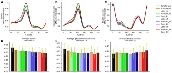 EMG results: Soleus (A,D), gastrocnemius lateralis (B,E), and tibialis anterior (C,F) normalized to peak EMG value during ZeroTorque. The timeseries shown in the upper row of panels were integrated and averaged over GC to produce bar charts in the lower row of panels. Yellow error bars show ± one standard deviation.