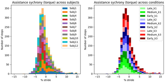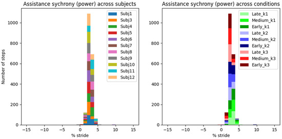 Histograms in Figure 7 and Figure 8 show the synchrony between the exo and the user’s own musculotendon system, using our newly defined metric of assistance synchrony (i.e., time lag between the peak exo’s assistive and the user’s biological push-off torques/powers).