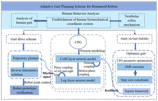 The structure of this paper is organized as follows: Section 1 is the introduction section, which describes the research status and trends of CPG in walking control of humanoid robots. Section 2 explores the development of the Kimura CPG neuron model based on the movement characteristics of the human body and details the design of specific spatial motion planning models. Section 3 delves into the theoretical foundation for achieving stable walking in humanoid robots and elaborates on the rules for CPG parameter modulation. Section 4 presents simulations and physical experiments of humanoid robot walking to validate the effectiveness of the proposed gait planning method, which integrates an optimization algorithm with CPG. The research concepts presented in this paper and the framework for CPG-based bionic gait design are illustrated in Figure 1.