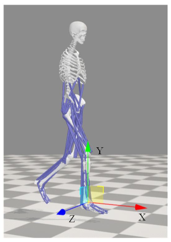 In this study, a global coordinate system for human motion analysis was established based on the biomechanical coordinate system definition standards of the International Society of Biomechanics (ISB) [32]. As shown in Figure 2, the y-axis represents the direction parallel to gravity, while the x-axis and z-axis lie within the sagittal plane and perpendicular to the y-axis, pointing forward and to the right, respectively.