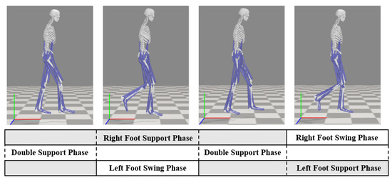 Human lower-limb walking is a smooth and stable motion achieved under the coordination and control of multiple joints by the nervous system, with movement synchronization governed by the CPG network. Walking simulations were conducted in OpenSim using an open-source human musculoskeletal model, and the gait characteristics during human walking were analyzed. A schematic diagram of the gait phases within one walking cycle is shown in Figure 3. For a single leg, the swing phase accounts for approximately 40% of the gait cycle, while the stance phase accounts for around 60%.