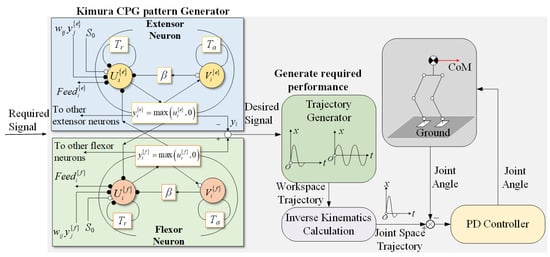 In the study of humanoid robot motion stability, the integration of model predictive control (MPC) and whole-body control (WBC) forms a well-established framework for bipedal walking control [5,6]. However, this control approach relies on a dynamic model to generate gait trajectories that satisfy dynamic balance constraints. During environmental interactions, it requires solving high-dimensional optimization problems in real time. Consequently, its response speed and generalization capability are constrained by model inaccuracies and computational latency, rendering it unsuitable for unstructured environments or unexpected disturbances [7,8]. As a biologically-inspired control paradigm, the Central Pattern Generator (CPG) offers a biomimetic approach for humanoid robot motion control by emulating the neural mechanisms underlying rhythmic movement regulation in vertebrates [9,10,11].