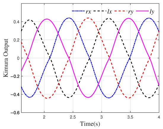 Based on the simulation results obtained from OpenSim, the outputs of the CPG designed to generate the motion components in the x and y directions for the left and right feet of the robot are denoted as , , , and . Here, l and r correspond to the left and right feet, respectively, while the subscripts indicate the x and y components. The neuron connections are configured as inhibitory connections, i.e., . The parameters are set as , , , , . The output of the oscillators with these settings is shown in Figure 5.