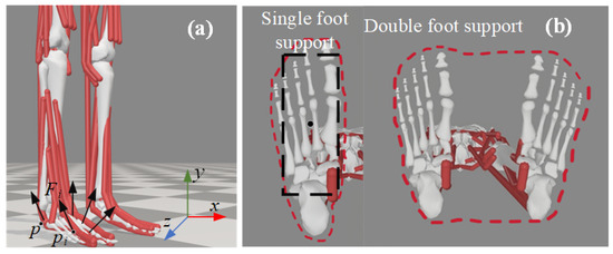 Through the design of the foot-end and CoM trajectory generators, a set of three-dimensional trajectories can be generated that shape-wise resemble human gait characteristics. However, these generated trajectories are insufficient to ensure the stable walking of the humanoid robot in space. For a moving humanoid robot, a practical criterion for gait stability is the ZMP stability criterion. The ZMP is the point at which the reaction moment from the ground on the foot is zero. When the ZMP lies within the contact area between the foot and the ground during the motion of the robot, the robot is considered to be stable and unlikely to tip over, and the gait is deemed stable. To illustrate the derivation of the ZMP, the force vectors acting on the foot are shown schematically in Figure 6a. Let the coordinates of the center of gravity be , and the coordinates of the ZMP be . The ground exerts a distribution of reaction forces at various contact points. The ZMP can be described by Equation (5).