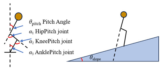 When the robot directly interacts with the environment, it must sense external feedback and adjust its behavior to maintain stability. When humans move on inclined terrain, they rely on the vestibular reflex to adjust their posture and maintain balance. Drawing on the biological mechanism of the human vestibular reflex, this paper simulates the inner ear vestibule through trunk inertial sensors to detect changes in robot posture. As illustrated in Figure 7, the terrain slope angle can be derived from the humanoid robot’s attitude and joint angle measurements.