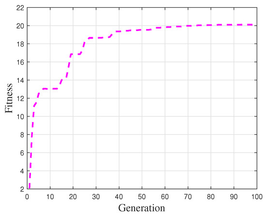 For the parameter settings of the genetic algorithm optimization process, the population size was set to 100, the number of generations to 100, the crossover probability to 0.8, and the mutation rate to 0.29. Based on these settings, the gait constraints of the robot were optimized. The fitness function value progression is illustrated in Figure 8.