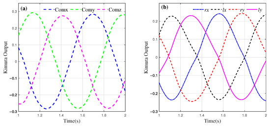 Let the outputs of the CoM CPG output be , , and . The corresponding mapping function in Cartesian space is presented in Equation (4).