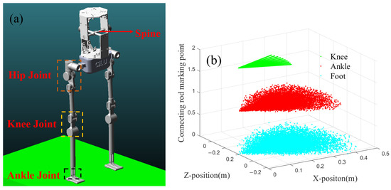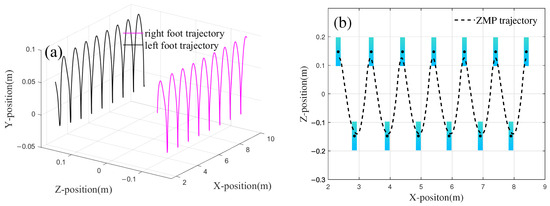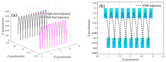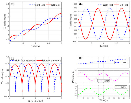 The foot trajectory generated based on the optimization results is shown in Figure 10. Figure 10a illustrates the displacement variations of the left and right feet in the x-direction over each unit of time. From the figure, it can be seen that after the biped’s displacement increases in the first half of the cycle, the displacement in the x-direction remains almost constant during the second half of the cycle, indicating that the foot is in the stance phase. Additionally, the distance between the two contact points represents the step length of the robot, with equal to 0.27 m.