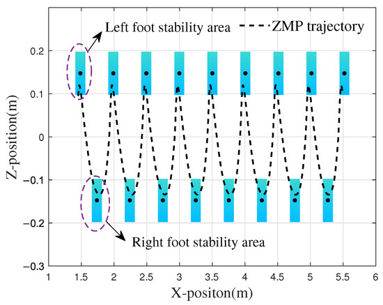 Based on the known foot and CoM trajectories, the ZMP trajectory in the x-z plane can be calculated using Equation (11). The rectangular stability region and the ZMP trajectory, with the ankle joint of the biped as the center, are shown in Figure 11.