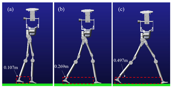 Among these variables, represents the adjustment coefficient, denotes the step size of the movement along the x-axis of the robot, H corresponds to the height of the robot in the gravitational direction, and is a constant. Furthermore, the sum of H and must fall within the range of [1.64, 1.86].