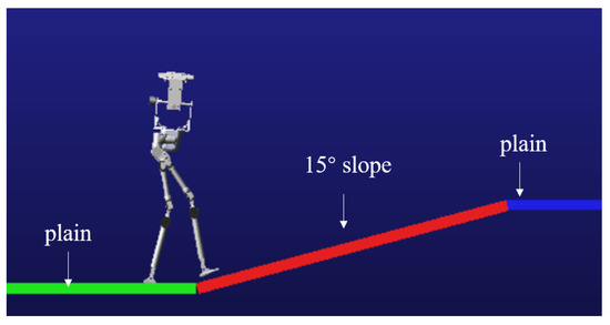 To verify the stability of the robot while walking on a slope with varying gradients, a simulation test is conducted. In the Tegotae function, the parameters is assigned a value of −0.01, is set to 5.2, and the threshold thre is defined as 0.18. In the simulation environment, the slope angle is configured to 15 degrees. The robot and the walking environment are shown in Figure 17.