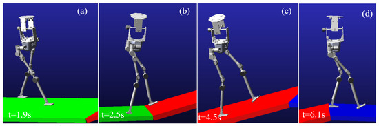 During the simulation, the robot begins walking from a flat surface, reaches the slope at 2.5 s, and transitions back to the flat surface at 6.1 s. The walking process of the robot in the virtual environment is shown in Figure 18.