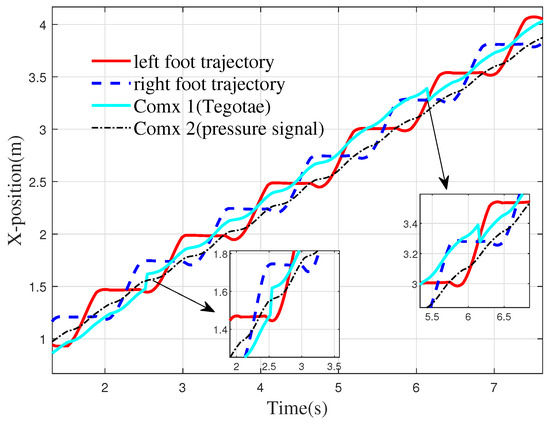 Robot foot and CoM movement. Comx 1 is the CoM trajectory with Tegotate feedback control used in this paper, and Comx 2 is the CoM trajectory with plantar pressure feedback control designed in reference [34].