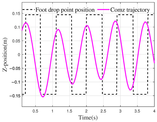 In designing the CoM trajectory, this study establishes a guideline ensuring that the oscillation of the CoM in the z-direction aligns with the motion of the right foot. Specifically, when the right foot makes contact with the ground, the CoM is expected to shift to the right. In other words, the offset value in the z-direction, as illustrated in Figure 10d, should correspond to the trough of the cycle at that moment. The trajectory of the CoM in the x-direction aligns well with the foot trajectory. In the z-direction, the oscillation amplitude does not exceed the boundary values of the feet coordinates during the standing phase, with an oscillation amplitude of 0.266 m. Additionally, the maximum displacement of the CoM in the y-direction is 0.042 m, with the oscillation in the y-direction being influenced by the height of the robot and foot movement.
