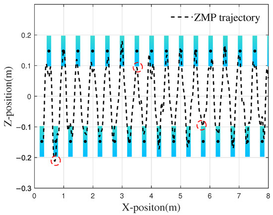The figure depicts nine gait cycles during the walking process of the robot, with the ZMP consistently remaining within the envelope polygon of the sole during single-foot support. When the right foot touches the ground at 5.48 m, the maximum distance between the ZMP and the center of the stable region is 0.0485 m, while the stability margin () at this moment is 0.021 m. During the walking process, the robot also engages in bipedal support. As shown in Figure 11, the variation range of the ZMP always remains within the closed polygon defined by the boundaries of the bipedal support region. The optimization results obtained through the genetic algorithm demonstrate that the planned robot gait achieves excellent stability.