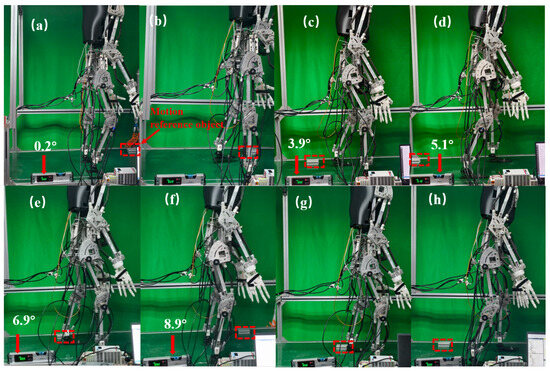 Figure 23a,b illustrate the first stage of walking, during which the robot moves on a nearly horizontal plane with a 0.2° inclination. As shown in panel (a), the robot lifts its right leg at 0.6 s; panel (b) depicts the left leg being lifted at 1.2 s. Figure 23c–h present the second stage of walking under variable slope conditions. Due to the physical constraints of the experimental setup, the maximum slope achievable was limited to 8.9°. At this inclination, the conveyor belt facilitates the robot’s transition from level-ground walking to slope walking. Panel (c) captures the robot’s walking posture as the slope gradually increases to 2.9°. At this point, the gait pattern shifts from straight-knee walking to bent-knee walking. Panels (d) and (e) represent the robot’s walking postures at slopes of 5.1° and 6.9°, respectively. Panels (f) to (h) display a complete gait cycle at the maximum slope of 8.9°. The robot completed postural adjustment for inclined standing at 15.9 s, characterized by flexed lower limbs, an upright stance, and a forward-leaning upper body to adjust the center of gravity. Subsequently, as shown in panel (g), the robot steps forward with the right leg at 17.2 s, followed by the left leg stepping forward at 18.4 s in panel (h).