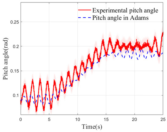 The robot was driven from a planar surface onto a gently sloped incline, with its posture and pitch angle variations depicted in Figure 24. At 5.2 s, the inclination angle of the conveyor belt was gradually increased from an initial value near 0° to a final slope of 8.9°. As the slope increased, the pitch angle of the robot in the forward direction increased synchronously. When the slope stabilized at the maximum inclination of 8.9° at 14.9 s, the amplitude of the pitch angle also converged, eventually maintaining fluctuations around approximately 0.2 rad. Due to the gap from the simulation to the experiment, although there are differences in the steady-state amplitude, the time history curve of the pitch angle measured in the experiment is in good agreement with the Adams simulation results in the main characteristics. The experimental results indicate that the Tegotae mechanism proposed in this study can be effectively integrated into the CPG-based feedback control system. By sensing slope changes in real-time and dynamically adjusting the spatial position of the center of mass, the mechanism significantly enhances the robot’s disturbance rejection and balance maintenance capabilities. This control strategy enables the humanoid robot to sustain dynamic stability on varying slopes and achieve continuous, smooth autonomous locomotion.
