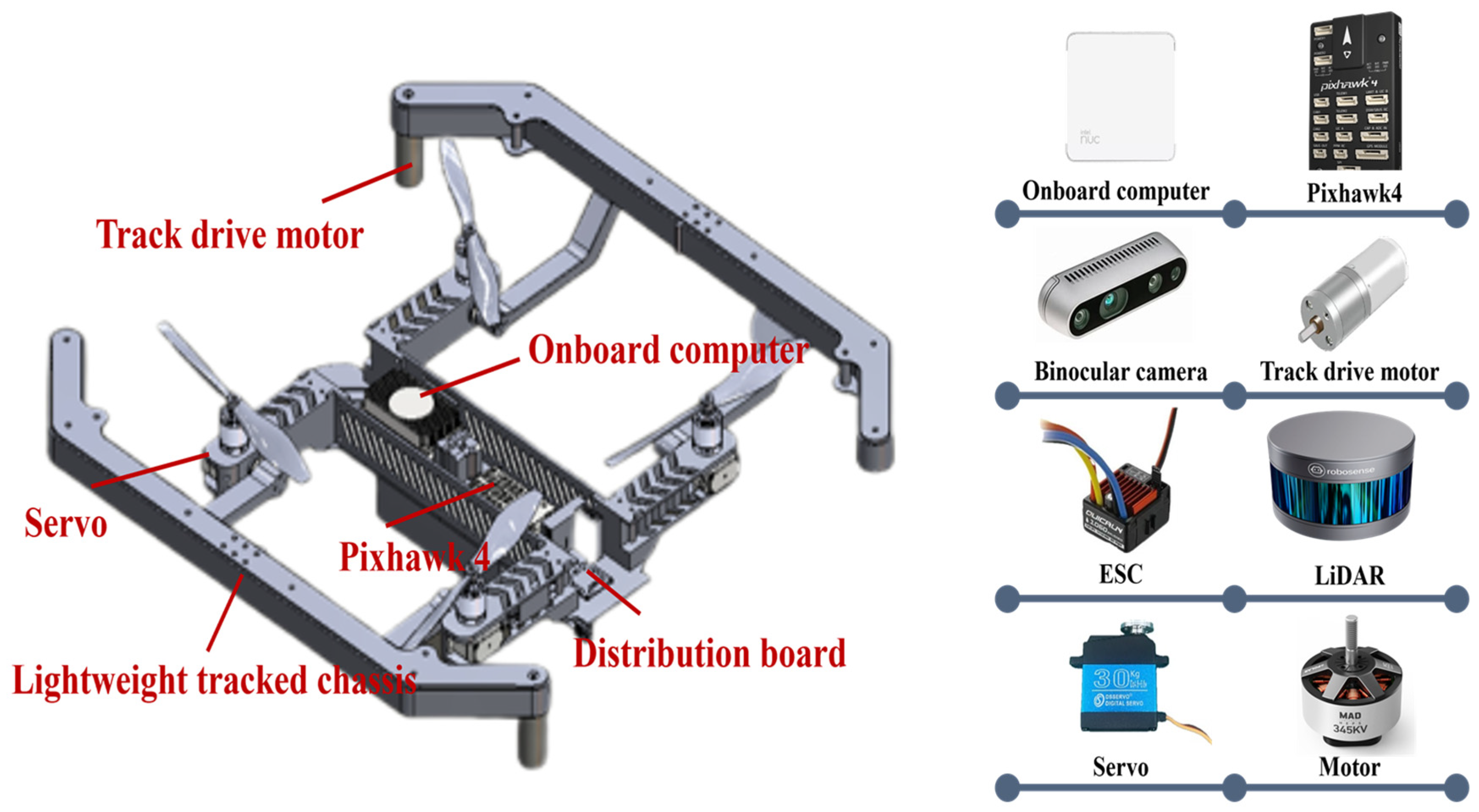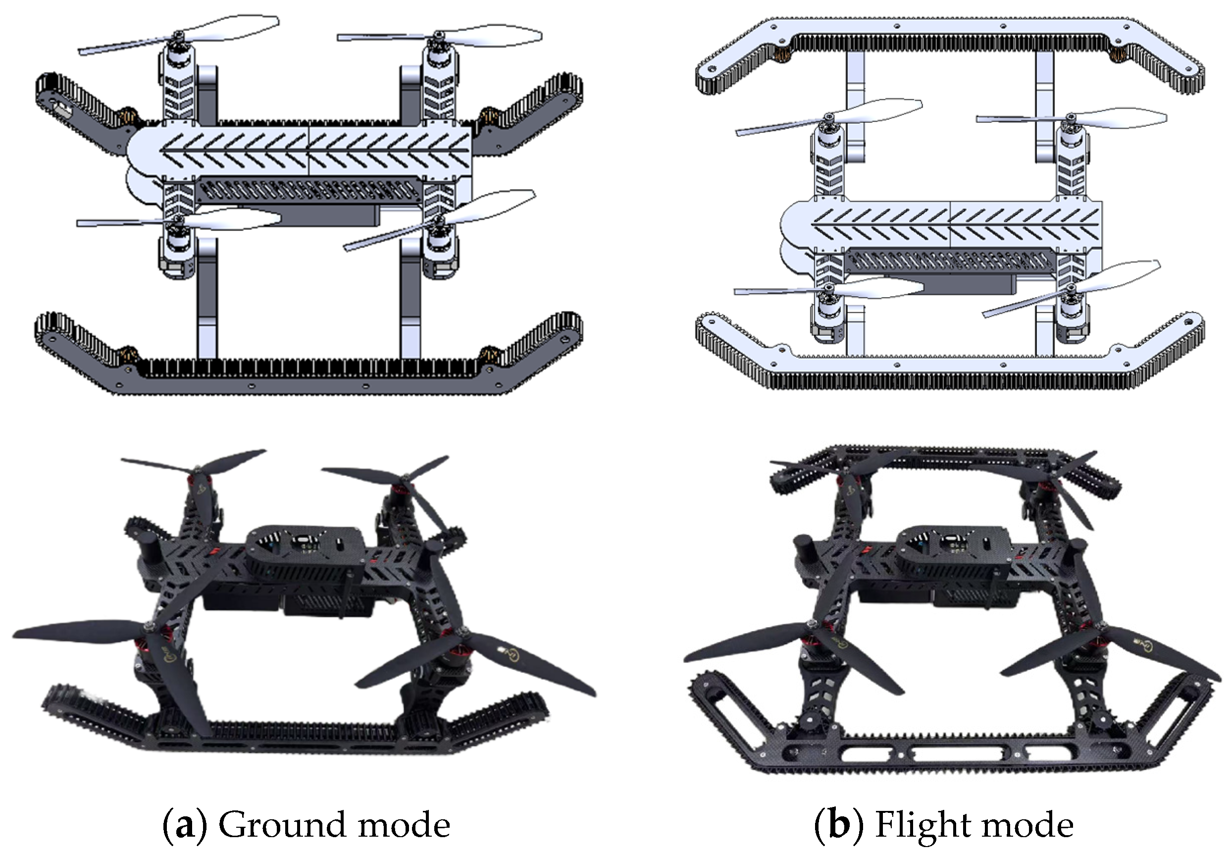 - Zhang, D.; Xu, M.; Zhu, P.; Guo, C.; Zhong, Z.; Lu, H.; Zheng, Z. The development of a novel terrestrial/aerial robot: Autonomous quadrotor tilting hybrid robot. Robotica 2024, 42, 118–138. [Google Scholar] [CrossRef]