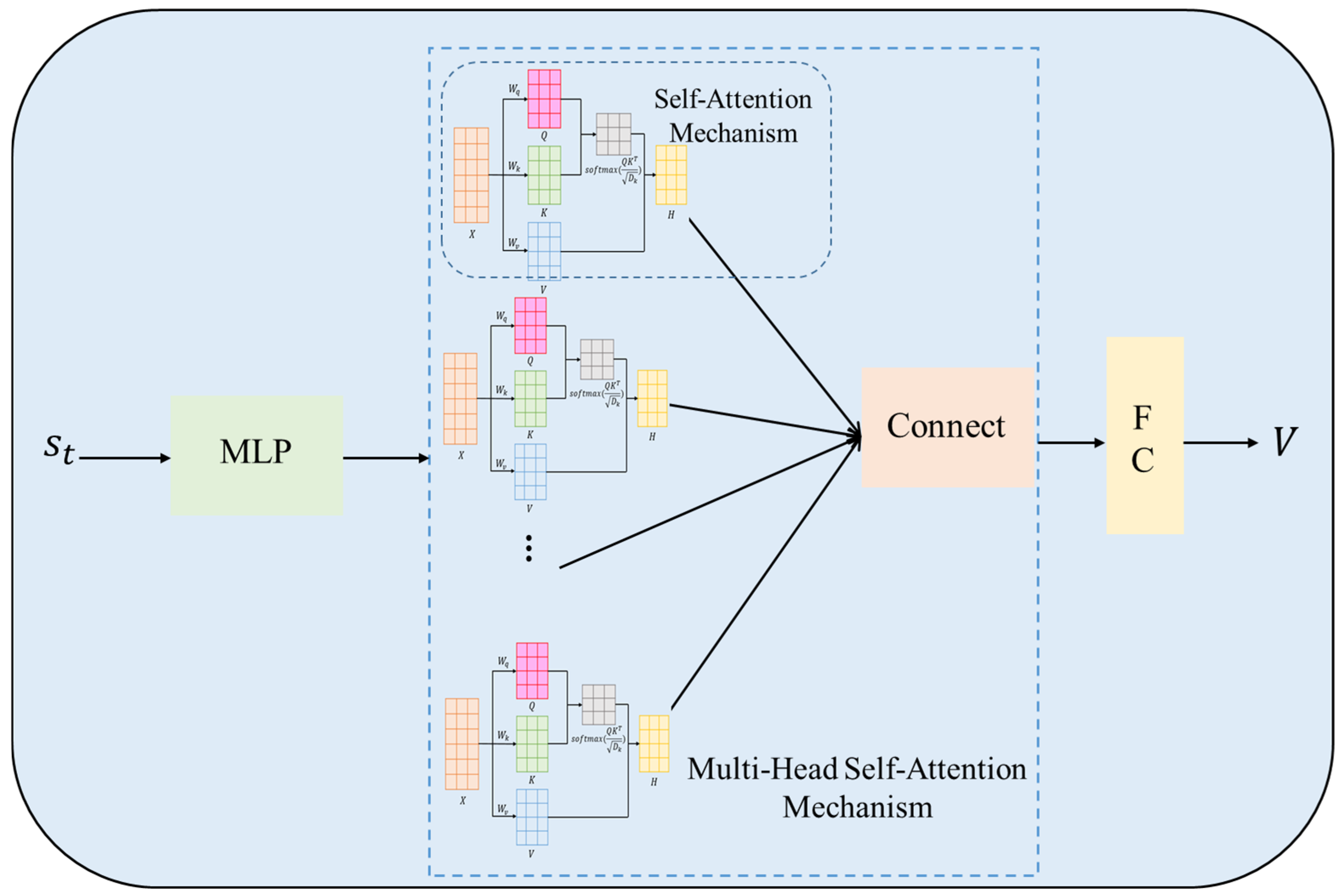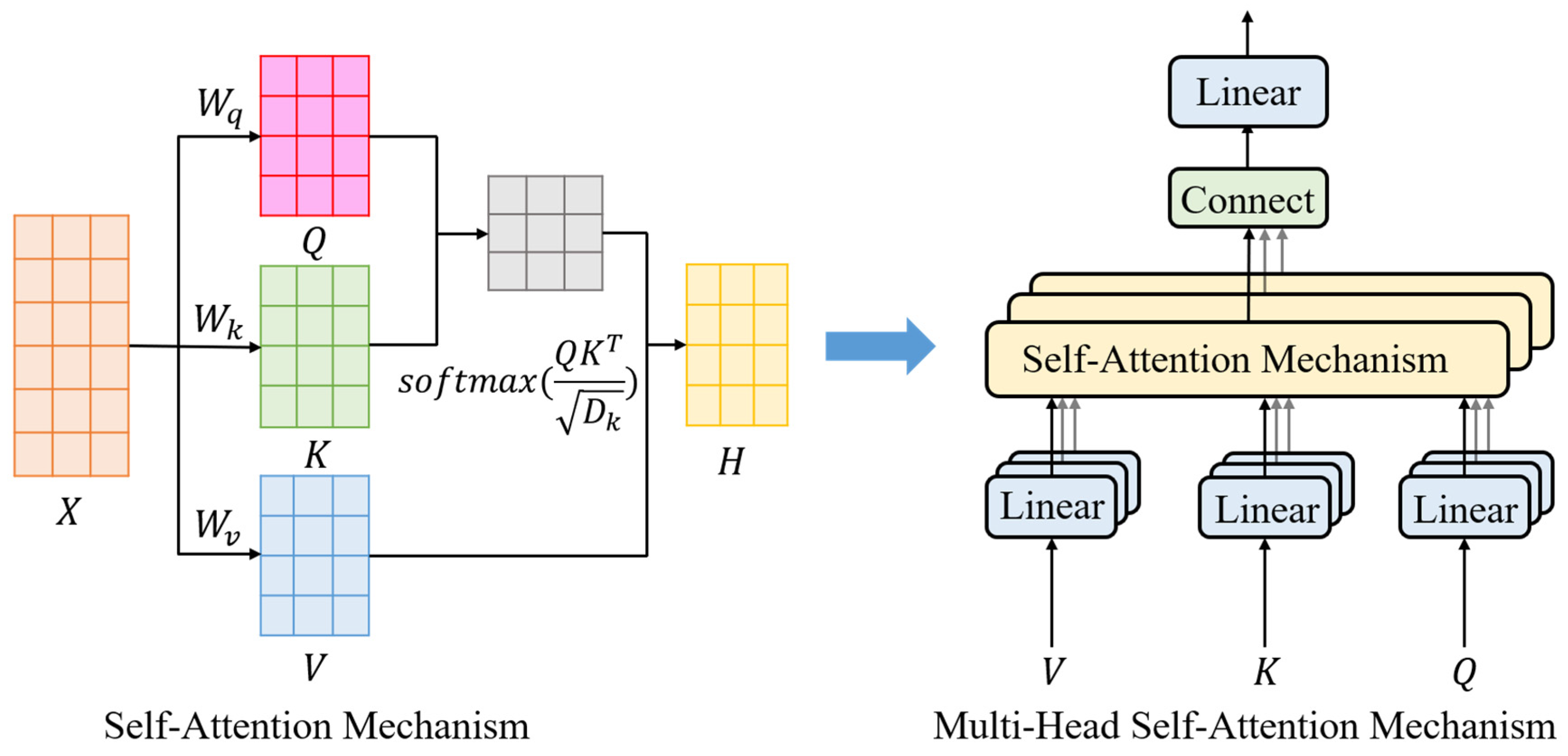 - Linear transformation: Assume that the input sequence is , where N is the length of the input sequence and D is the feature dimension of the input. For each attention head i, through different linear transformation matrices , and , we obtain the query matrix , key matrix and value matrix. The calculation formula is shown in Formula (27):