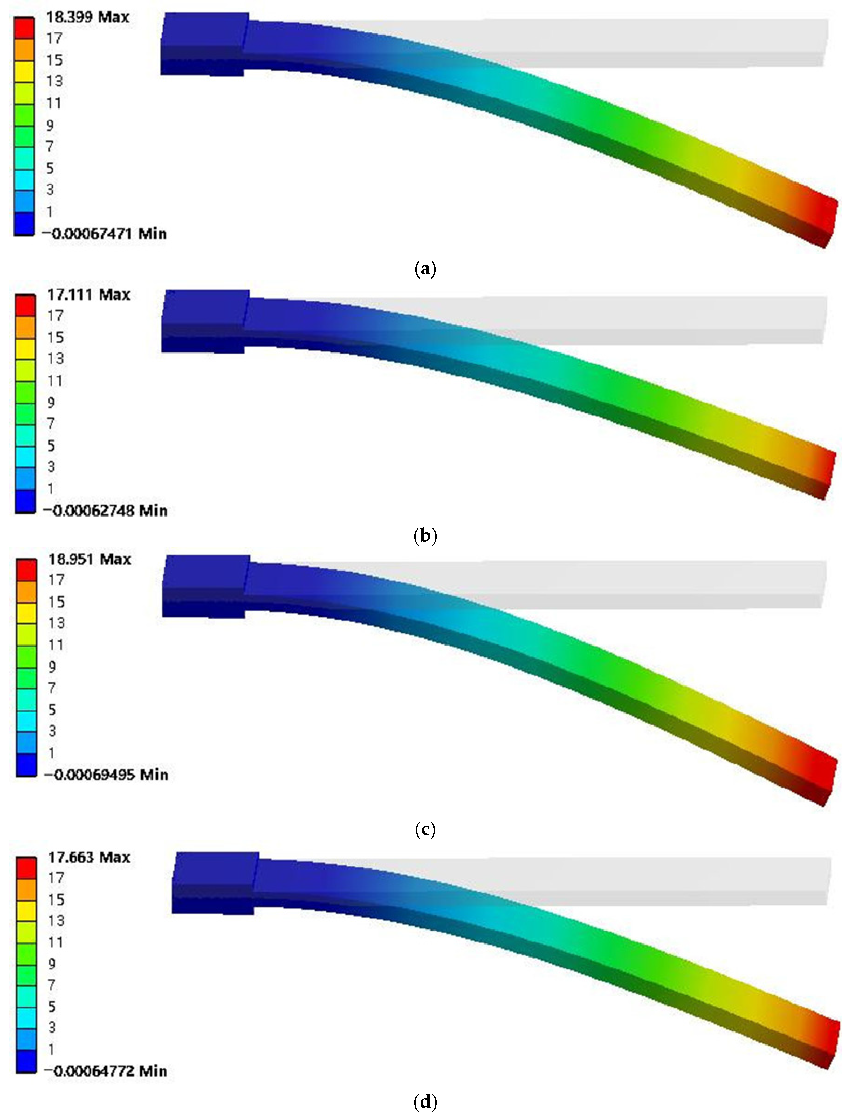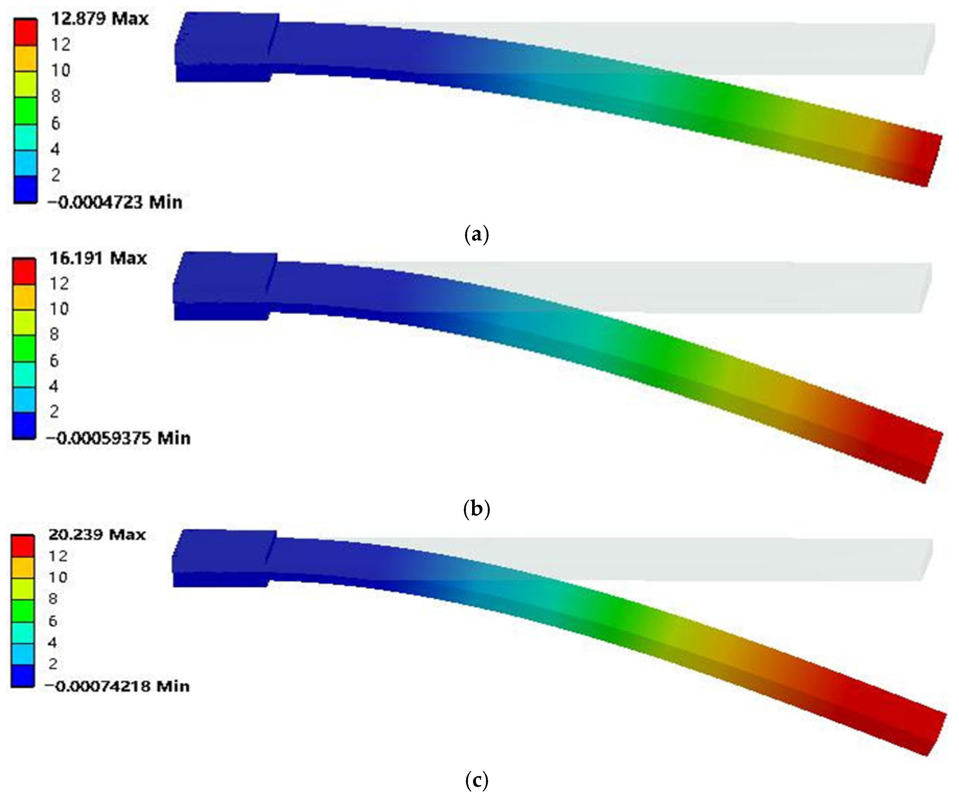 - Increasing the driving voltage can also significantly enhance the deflection displacement of the bionic artificial muscle. As the voltage increases, the simulated displacement at the tip of the artificial muscle shows a linear growth trend, with an average increase of 0.9 mm in displacement for every 1 V increase in voltage.
