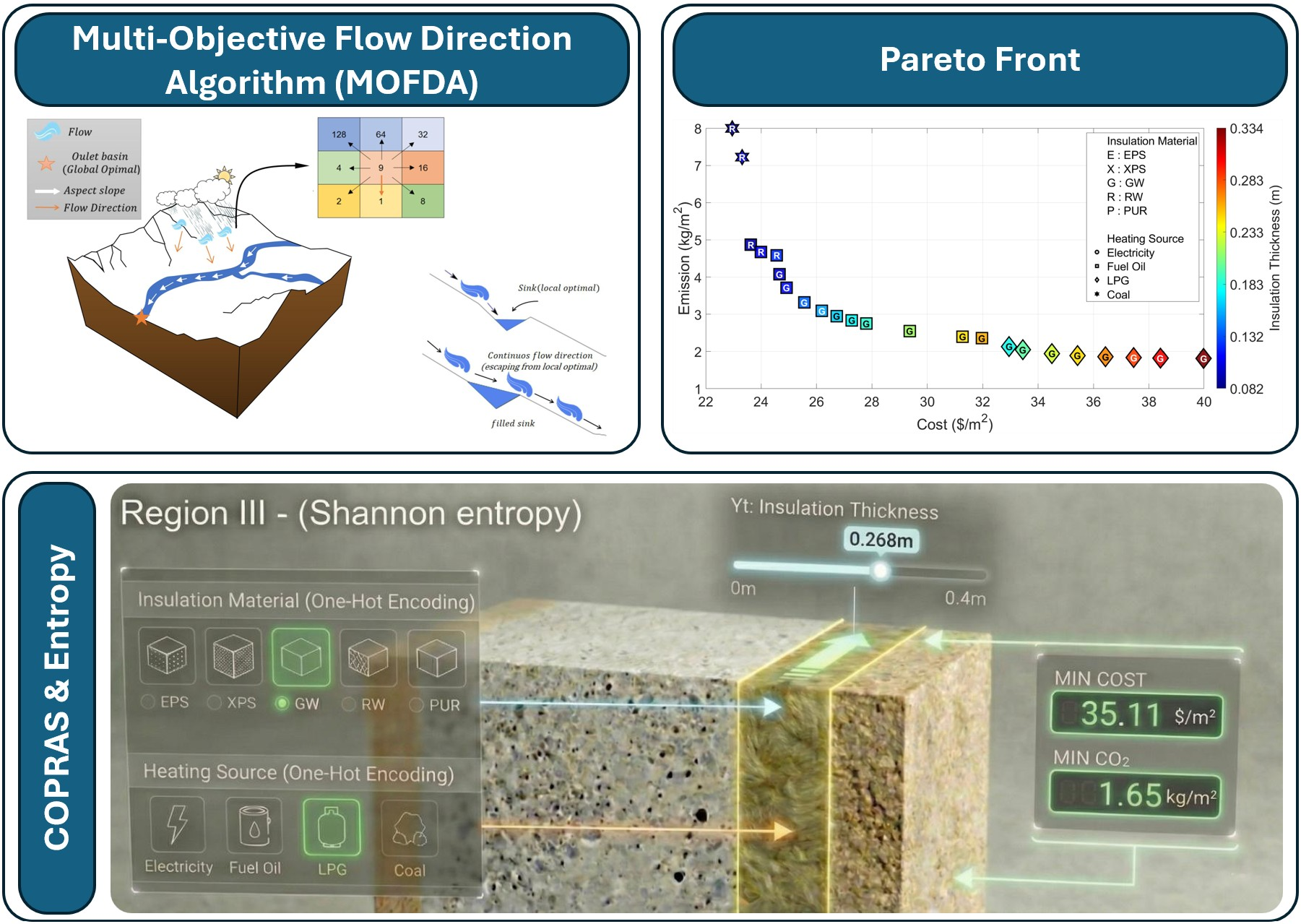 | This study | MOFDA + One-Hot Encoding | Insulation thickness, Insulation material, Fuel type, Climate zone | Economic cost, Carbon emissions | Six climate zones | COPRAS + Shannon Entropy |