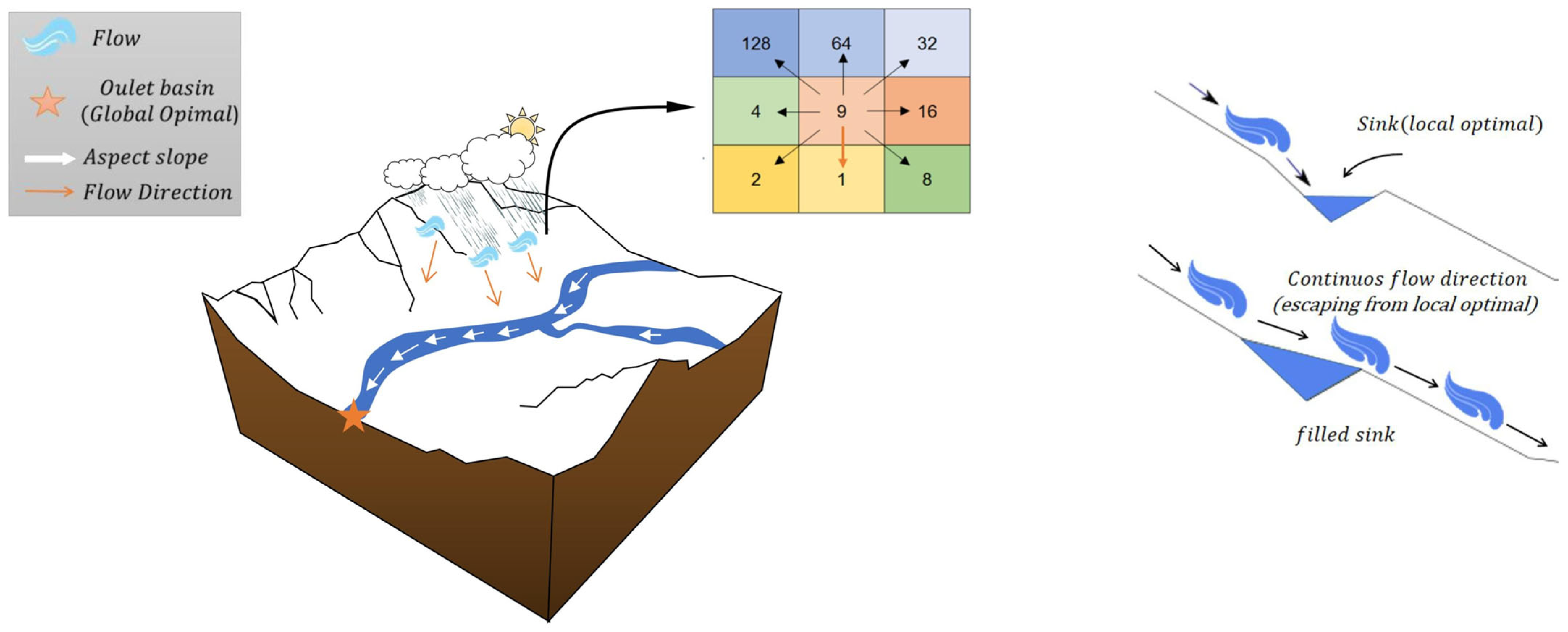- Lin, H. Flow Direction Algorithm: A Comprehensive Review. Arch. Comput. Methods Eng. 2025, 32, 3063–3079. [Google Scholar] [CrossRef]