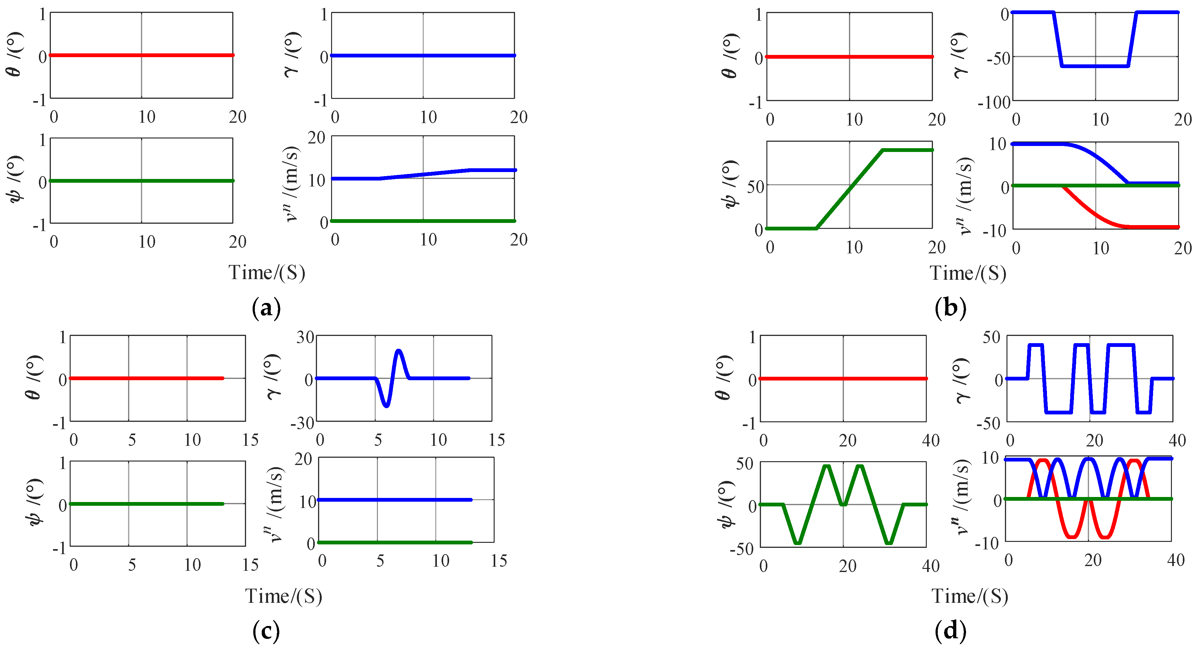 Under the aforementioned validation framework, a representative cooperative simulation environment for the master and slave INS must first be established. The master platform represents a surface or underwater carrier equipped with a high-precision master INS, while the slave platform represents the underwater bionic robot to be deployed; before deployment, the two are connected via a hybrid rigid–flexible structure, such as a hanger, launch tube, or flexible robotic arm. Considering that the underwater bionic robot typically experiences typical maneuvers such as acceleration, turning, fin flapping, and combined maneuvers during actual missions, four representative carrier motion conditions are designed in PSINS: accelerated straight-line motion, coordinated turn, periodic fin flapping, and S-shaped maneuver. The simulation timeline adopts a unified arrangement of “uniform straight sailing for the first 5 s and the last 5 s, with the target maneuver executed in the middle segment”. The roll angle of the fin-flapping motion is generated as a sinusoidal function with given amplitude and angular frequency, and the S-shaped maneuver is constructed by alternating left–right coordinated turns. The corresponding key parameters are listed in