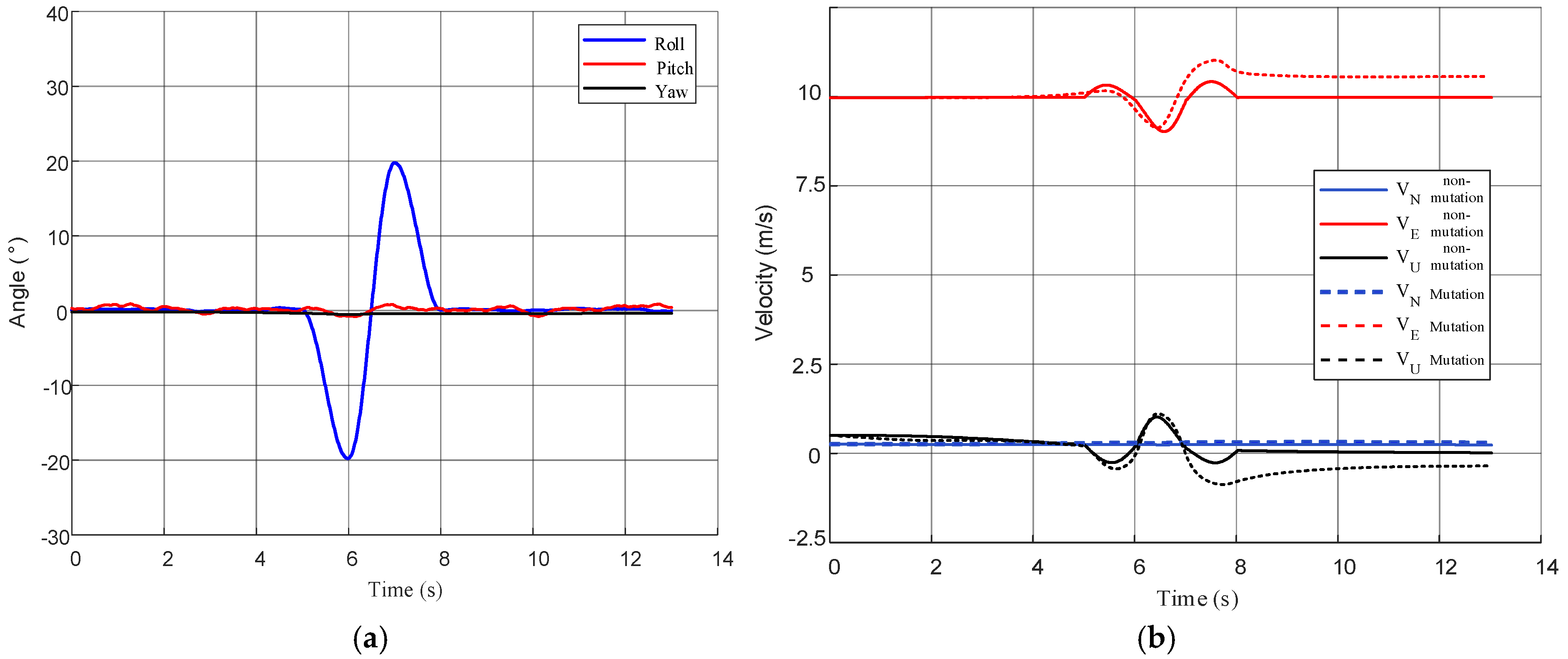 Figure 4 first presents the attitude and velocity simulation results of the slave INS under this condition. It can be observed that the attitude maintains significant periodic oscillations throughout the alignment period, and the velocity also exhibits obvious non-stationary variations, providing favorable conditions for evaluating the performance of various compensation strategies under strong excitation scenarios.