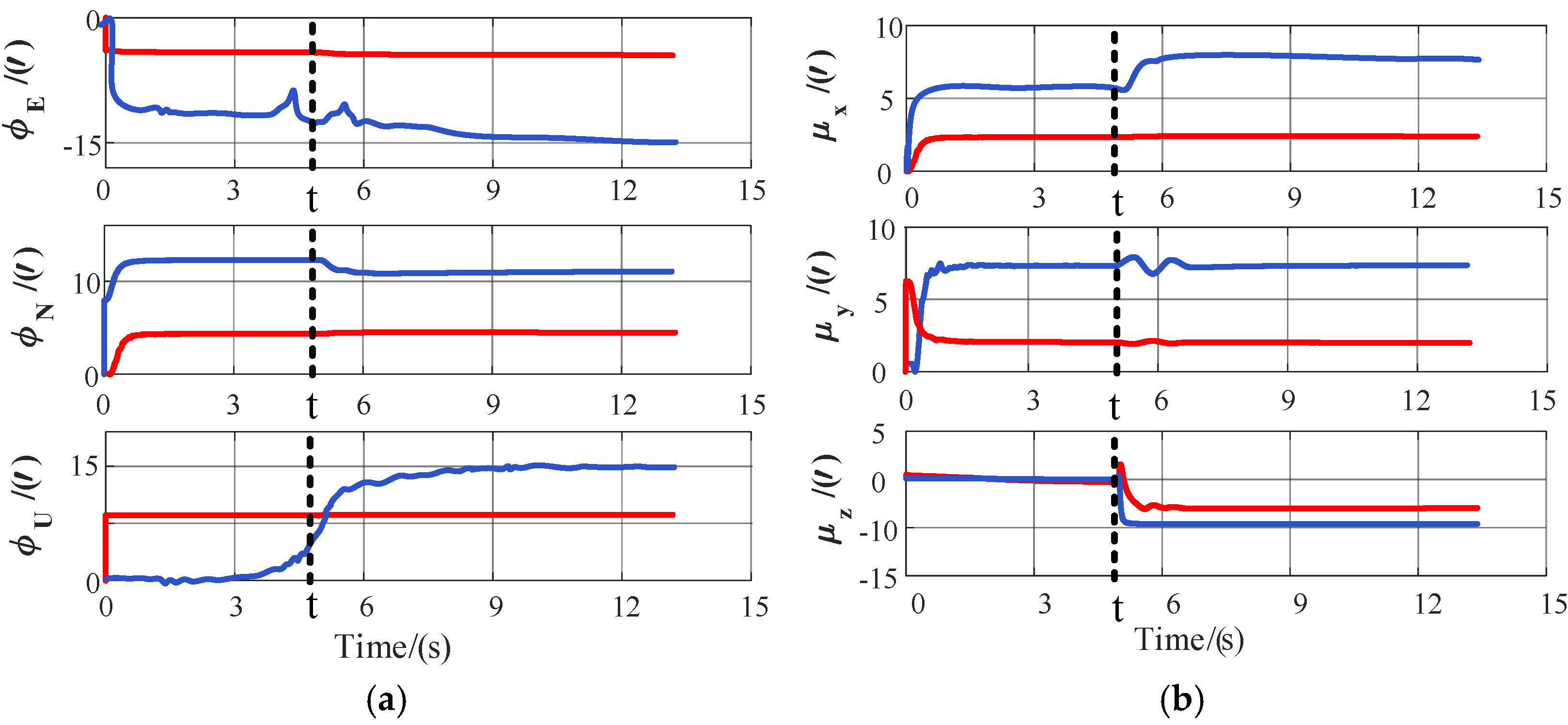 To examine the algorithm’s adaptability to lever-arm abrupt change, a step-type rigid lever-arm abrupt change in the same direction was imposed on the above fin-flapping trajectory: the equivalent lever-arm length jumped from A = 1 to A = 2 (simulating a sudden mechanical extension or reconfiguration of the deployment boom, where the lever-arm magnitude doubles while the direction remains unchanged). The conventional physical compensation strategy kept using the initially calibrated value throughout the whole alignment and performed no on-line correction for the abrupt change, so significant model mismatch appeared after the jump.
