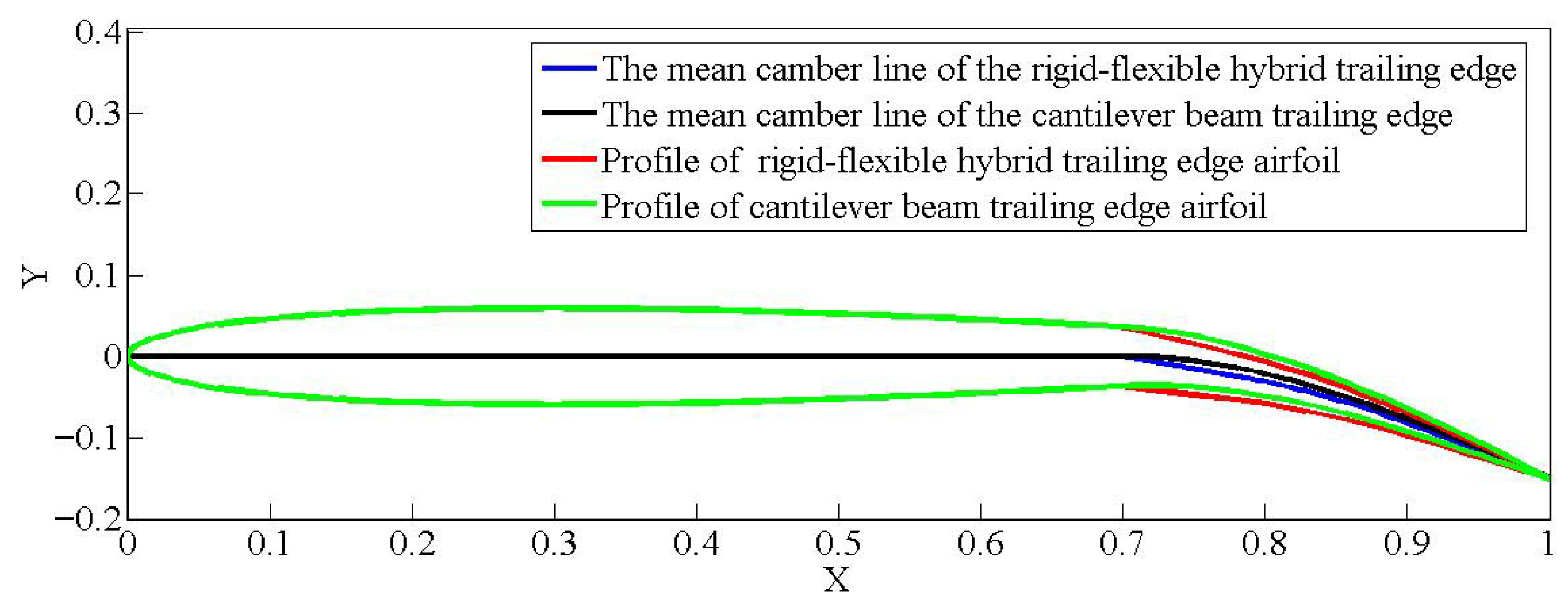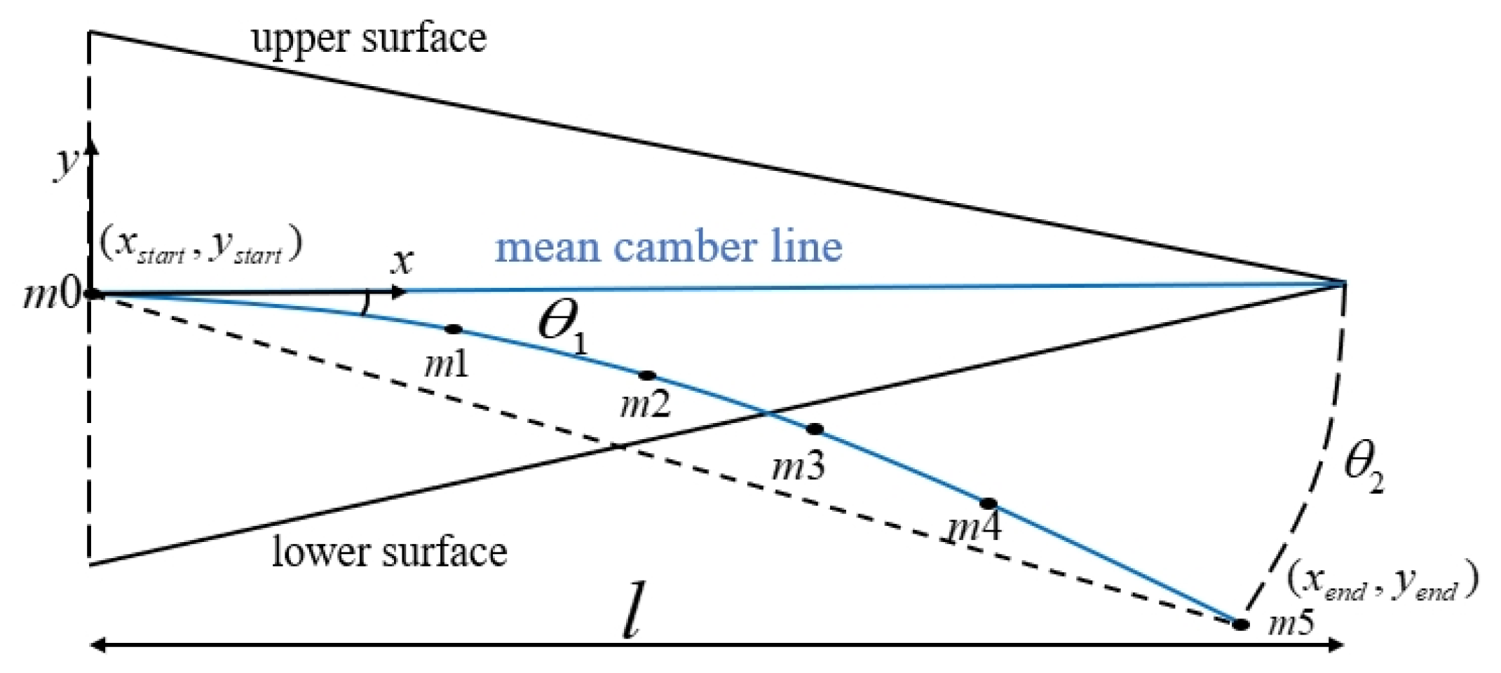 Figure 2, the six points (m0 to m5) are located on the mean camber line of the airfoil, where m0 is the leading edge point of the variable wing camber section and m5 is the trailing edge point. Furthermore, m1 and m4 are the rigid–flexible junction points, while m2 and m3 are points with x-coordinates of 40% and 60% of the trailing edge chord length, respectively. Moreover, points m2 and m3 are located on the middle flexible segment arc [