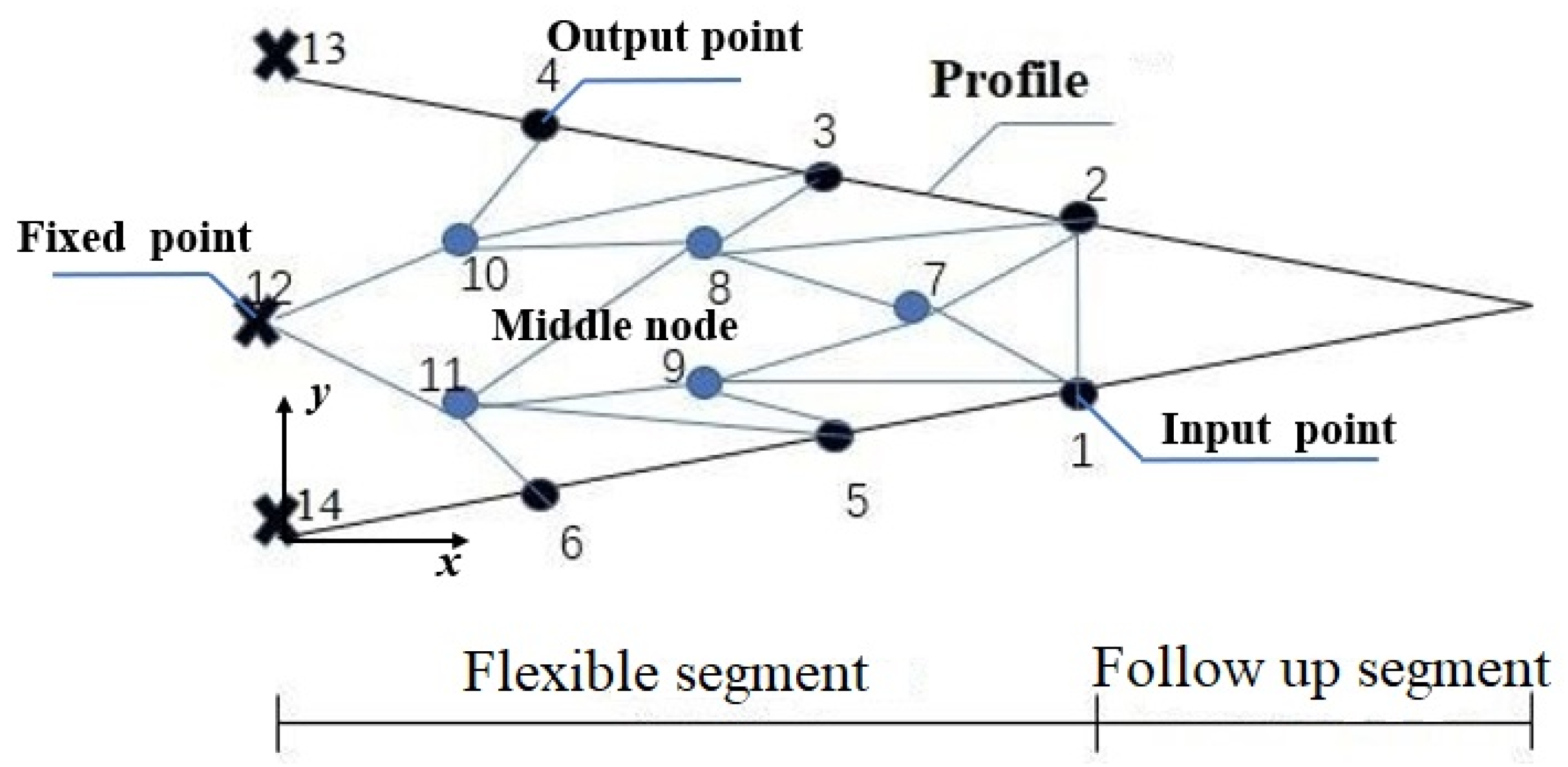 According to the flexible segment deformation requirements, output points are evenly distributed on the upper and lower wing rib surfaces, with a total of six output points (points 1, 2, 3, 4, 5, 6). There is one input point, and, since its position is at the lower wing rib edge, it is both the input and output point (point 2). The middle node is an important segment of the load path method. Different topological shapes are obtained by varying the number and location of the middle node. Simultaneously, the middle node is also a bridge connecting the elements. Therefore, determining the number of middle nodes and their locations is a rather important task. Considering the completeness of the topological shape results, the optimization calculation efficiency, and the processing feasibility, it is reasonable to select 4–10 intermediate nodes. In this article, five intermediate nodes were used (points 7, 8, 9, 10, 11). Points 12, 13, and 14 are fixed, with point 14 having freedom of movement along the X direction.