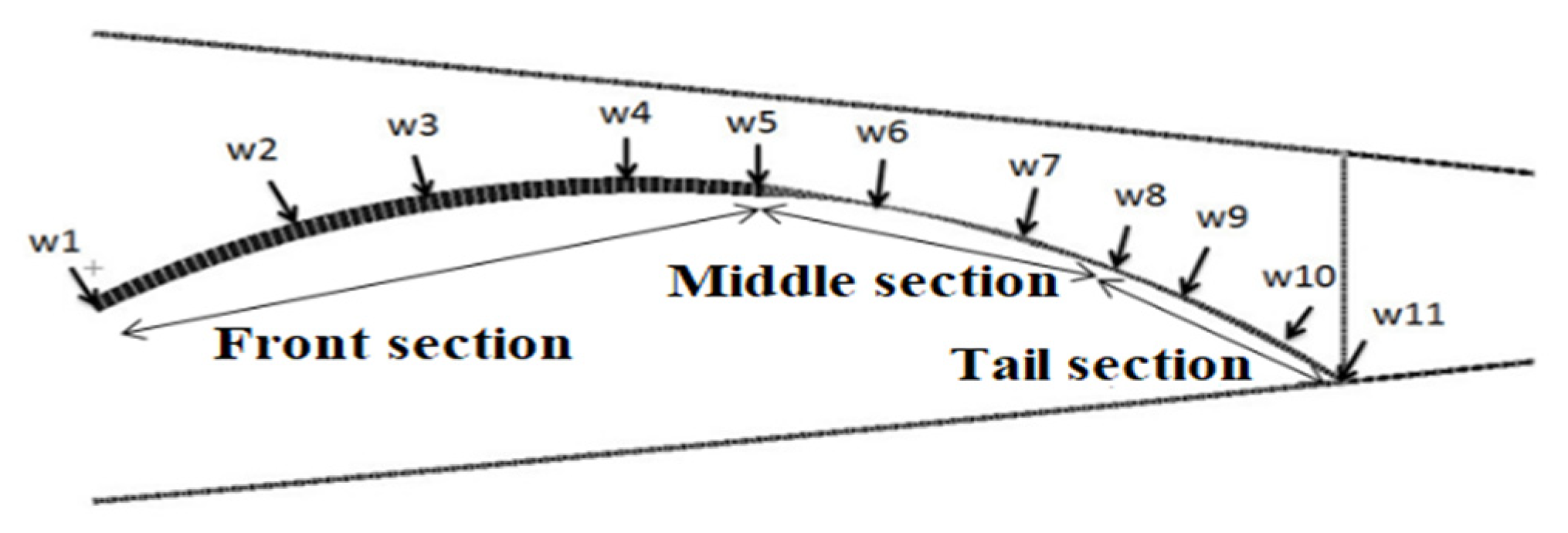 The rectangular beam cross-section was selected in the structure. When the bending of the wing rib flexible segment structure changes in the chord direction, the beam element thickness H will significantly affect the structural stress level. The main penetrating beam can be divided into the front section, middle section, and tail sections with two key nodes as dividing points. Each beam element was continuously arranged with respect to the sectional points W1–W11. The schematic diagram of sectional point arrangement is shown in