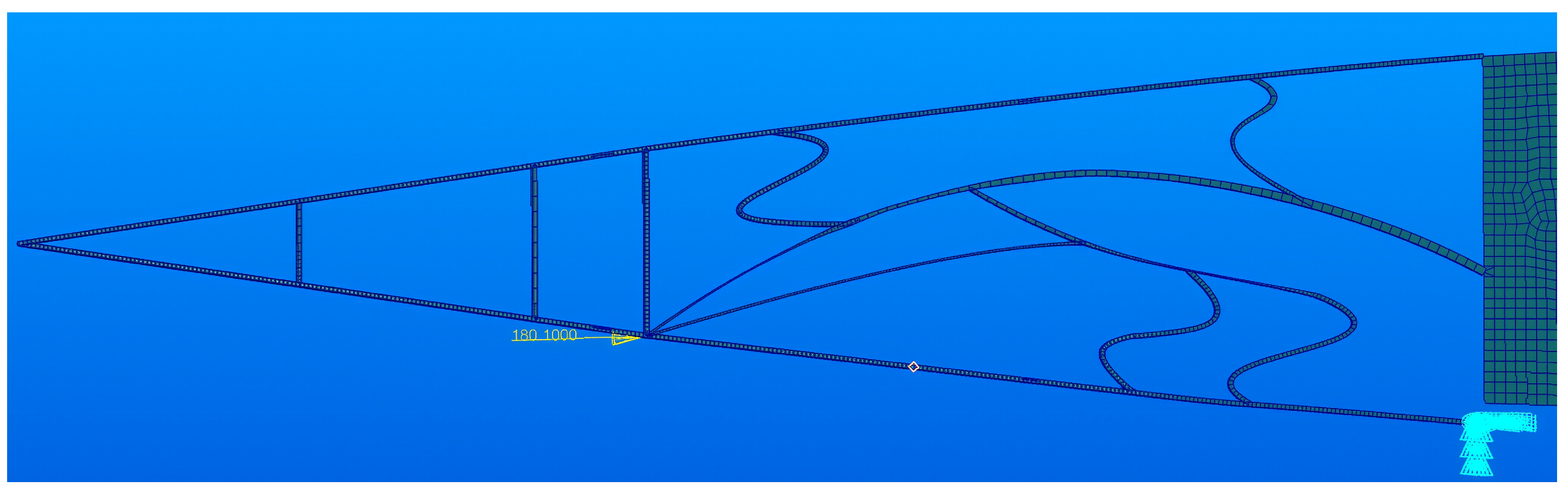 3. In the modeling process, beam elements were applied to the flexible and follow-up segments, whereas shell elements were used for the rigid rotational segment. Given that this paper primarily investigates the deformation of the flexible segment, the boundary conditions were configured accordingly: the rigid rotational segment was partially fixed, and two out of the three connection points between the flexible and rigid segments were fixed. The connection point at the lower edge of the wing rib was allowed freedom in the X direction to alleviate internal structural stress. When the connection point at the lower edge was also immobilized, indicating that the flexible structure was rigidly connected to the rigid segment at three points, under such boundary conditions, a significantly larger driving force was required to attain the target deformation at the endpoints of the structure. Concurrently, the maximum stress near the connection at the lower edge of the rib and within the ‘S’-shaped substructure located at the lower portion of the rib substantially surpasses the material’s permissible stress, leading to structural damage. The finite element model underwent a stepwise mesh refinement from coarse to fine, with computations carried out on three distinct mesh densities. The results showed that the maximum stress and deformation were both below 2%, confirming mesh convergence, as detailed in