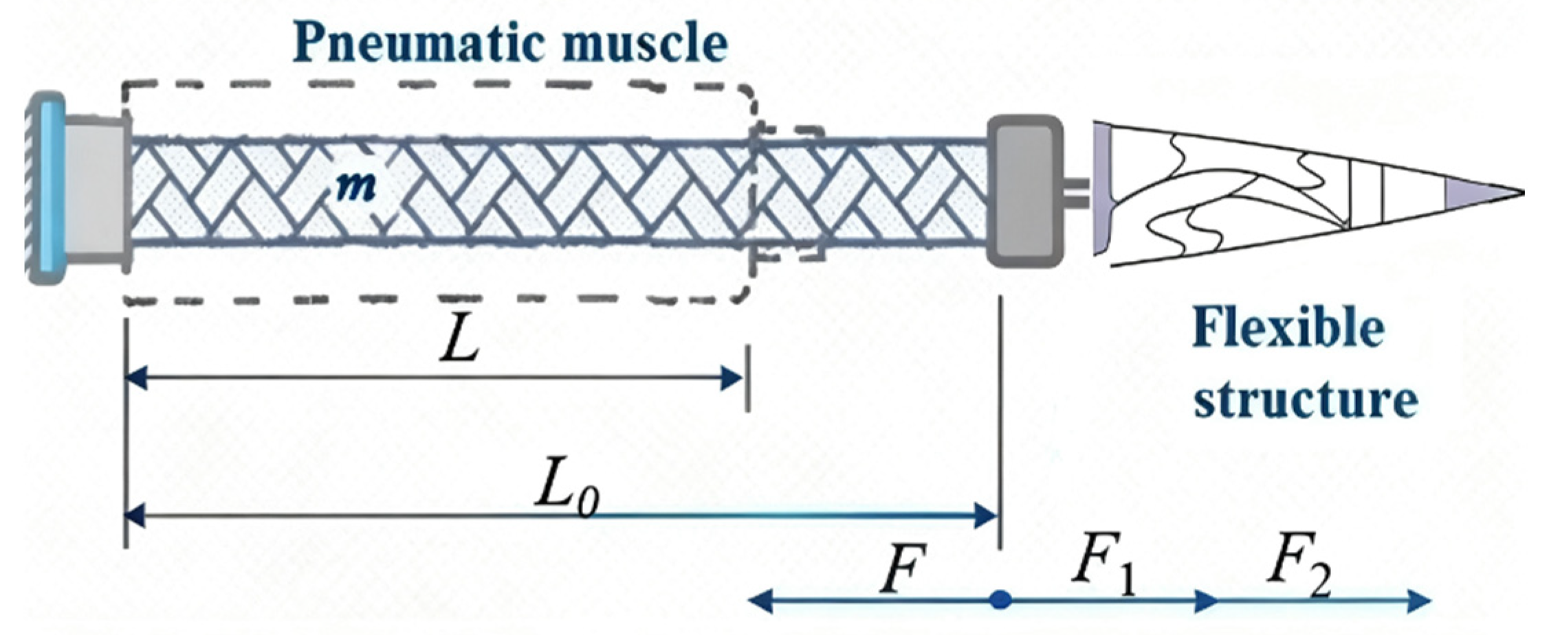 Here, m is pneumatic muscle quality, L represents the real-time length of the pneumatic muscle, F1 is the elasticity of pneumatic muscle rubber sleeve, F2 is the force load, and F is the pneumatic muscle contraction.