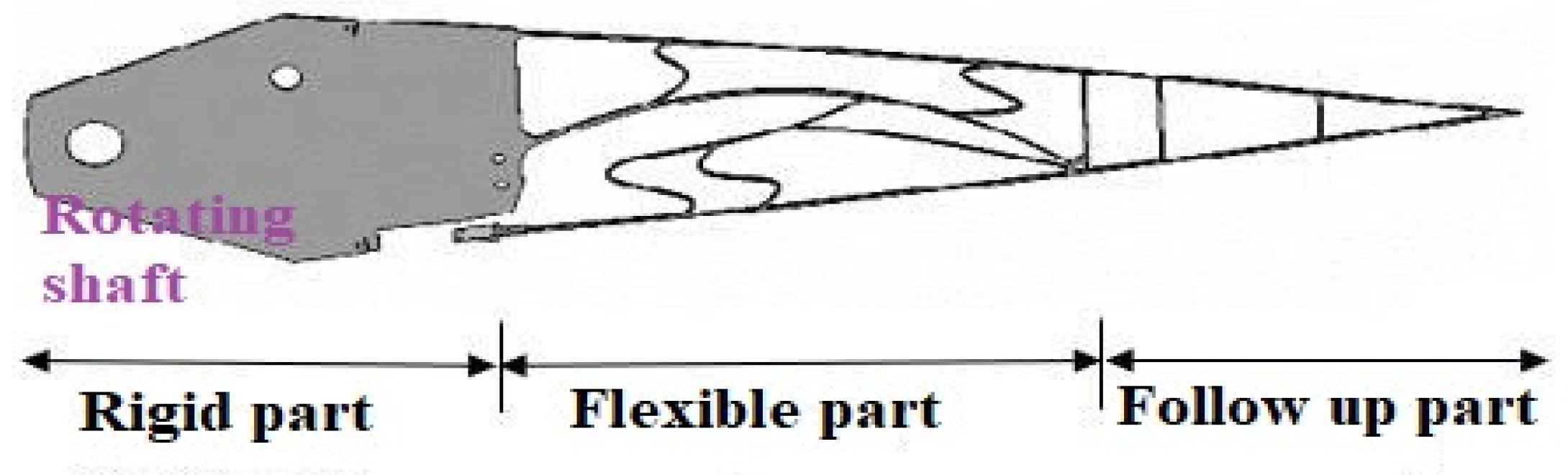 Figure 1. In the variable bending section of the wing trailing edge, structure types were arranged alternately in three sections. They were rigid segment, flexible segment, and follow-up segment, which accounted for 30%, 40%, and 30% of the total wing trailing edge.