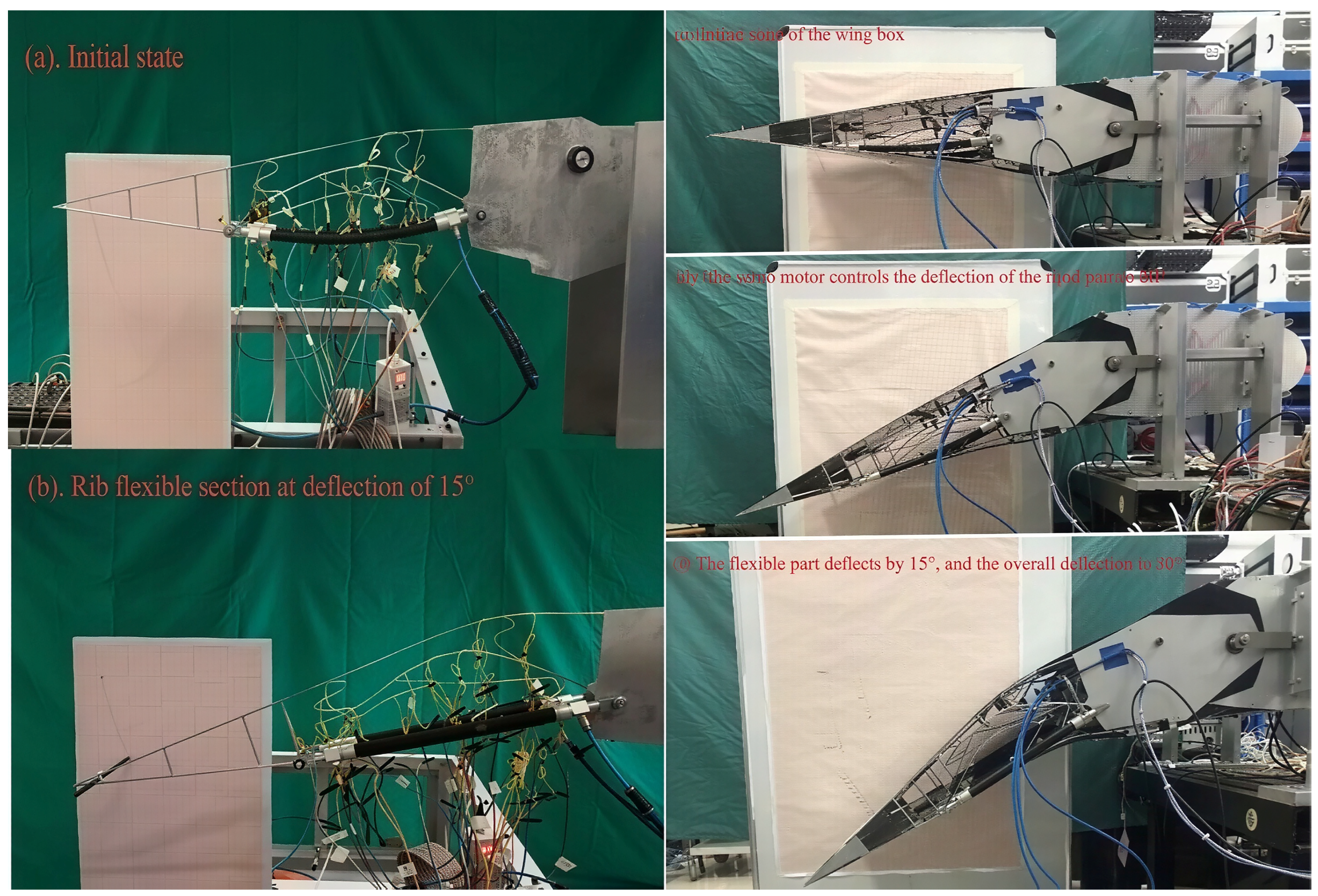 The hybrid structure variable camber wing rib in this paper needs distributed driving. The rigid segment uses a servo motor to drive a linkage mechanism for precise deflection control. The flexible structure, the design’s focus, with a longbow-like variable cross-section beam as its main deformation part, uses pneumatic muscle (