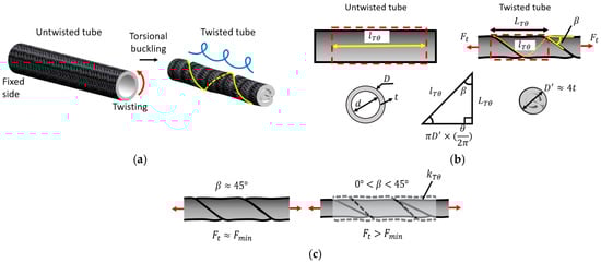 The TTA geometry for a given twisting angle is illustrated in Figure 3b. The length of the untwisted tube is denoted by , the outer and inner diameters by and , respectively, and the tube wall thickness by . When the tube is twisted by an angle , the twisted length is denoted by , and the diameter of the twisted segment is denoted by (with ). Here, is the lead angle of the helical pattern.