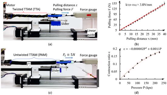 Experimental characterization of stiffness of twisted TTAM (TTA) and contraction ratio of untwisted TTAM (PAM). (a) Measurement of the stiffness of the twisted TTAM. (b) Experiment results of the stiffness of twisted TTAM. (c) Measurement of the contraction ratio of the untwisted TTAM with different internal pressures. (d) Experiment results of the contraction ratio vs. the pressure.