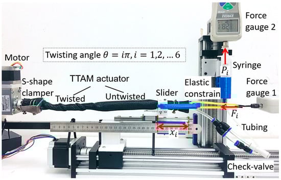 A sample TTAM is manufactured for experimental characterization. The TTAM prototypes are low cost and easy to make, as shown in Figure 5, and major components of a TTAM include a rubber tube (natural rubber tube, outer D = 17 mm, inner d = 14 mm), a braided nylon mesh tube, two tube clamps, two seals (one for motor connection, another for tube connection), an S-shape clamp for pre-buckling of the tube, and an adaptor to help fix the TTAM on the linear guide. All the above-mentioned components are low cost and can be mass-produced. When all the components are ready, it only takes a few minutes to assemble a TTAM.