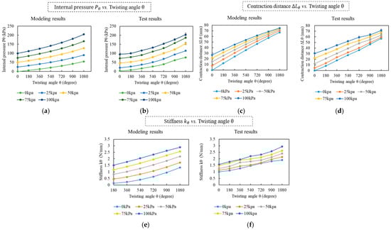 During the test, the TTAM is charged with five different initially pressures : 0 kpa, 25 kpa, 50 kpa, 75 kpa, and 100 kpa. There are five groups of tests in total, the TTAM is twisted for in every group of tests, and each test group is conducted repeatedly, five times, to eliminate measuring errors. We measure down the internal pressure and contraction distance for every twisting. To measure the relationship between the twisting angle and the internal pressure, the tension force of the TTAM was set as a constant value 5 N. The average values of the experimental results and corresponding modeling results are plotted in Figure 8.