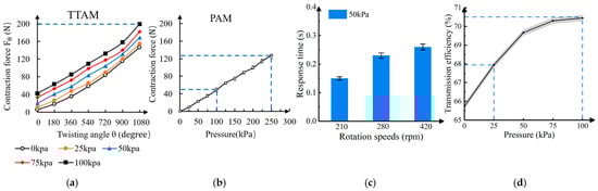 Experimental characterization of the TTAM and comparison with a conventional PAM. (a) Experimental results of the TTAM contraction force vs. twisting angle . (b) Experimental results of the conventional PAM contraction force vs. pressure. (c) TTAM response time under different twisting speeds (210, 280, and 420 rpm). (d) Transmission efficiency of the TTAM under different pressures.