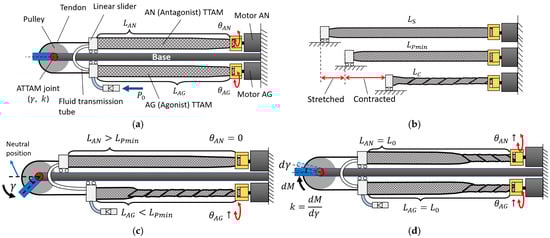 The design and working principle of the ATTAM joint is shown in Figure 10. In Figure 10a, a pair of TTAMs are mounted on a base; one is defined as Agonist (AG) TTAM, the other is Antagonist (AN) TTAM. The AG and AN TTAMs are connected through a fluid transmission tube. Therefore, during the actuation process, the pressure inside the AG and AN TTAMs remains the same all the time. Free ends of the AG and AN TTAMs are fixed on two linear sliders that can move back and forth along the base; a pulley is driven by the AG and AN TTAMs through tendons. We define and as the twisting angle of the AG TTAM and AN TTAM, respectively, and and are the ATTAM joint angle and joint stiffness.