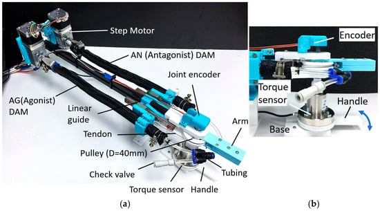 Experimental platform of ATTAM joint. (a) Components of the experimental platform. (b) Sensors for measuring joint angle and joint stiffness.