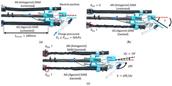 Figure 12 shows the test process of the ATTAM joint. In Figure 12a, the ATTAM joint is in the neutral position, and the AG and AN TTAMs were charged with certain pressure and in contract state, so that it is stretchable and has natural compliance just like an air spring. The length of the TTAM prototype in the rest state is 300 mm, and we define the minimum pressure for the ATTAM as 60 kPa. When the TTAM is charged with 60 kPa, the contraction ratio is about 0.06, and the contraction length is about 20 mm. Therefore, the is about 280 mm. In the experimental tests, the ATTAM joint is charged with different pressure levels, i.e., 60 kPa, 80 kPa, and 100 kPa.