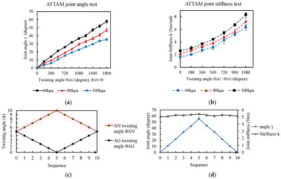 Experimental results of the joint angle and joint stiffness. (a) Experimental results of TTAM joint angle vs. twisting angle , . (b) Experimental results of the ATTAM joint stiffness vs. twisting angle . (c) Control sequence of the twisting angle and . (d) Experimental results of the joint angle and joint stiffness change with control sequence of (c).