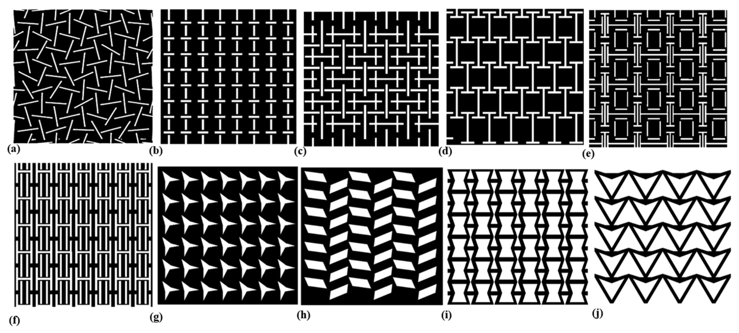 - Grima, J.N.; Mizzi, L.; Azzopardi, K.M.; Gatt, R. Auxetic Perforated Mechanical Metamaterials with Randomly Oriented Cuts. Adv. Mater. 2016, 28, 385–389. [Google Scholar] [CrossRef]