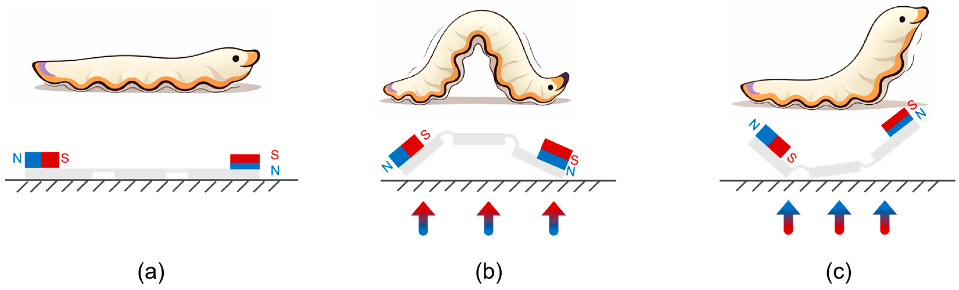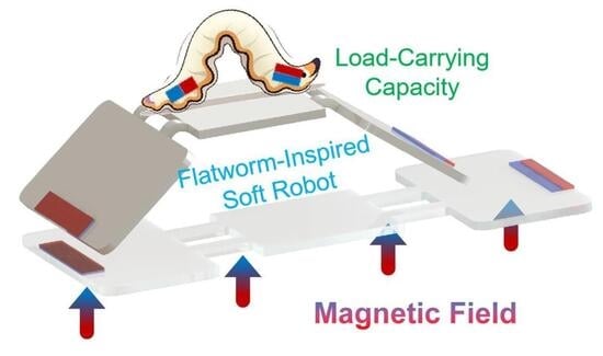 By translating the flatworm’s muscular architecture into a synergistic structural design, we effectively pre-program the required gait dynamics into the soft body. The core novelty of this work is the implementation of a staggered magnetization scheme within a segmented three-part architecture connected by flexible elastomeric hinges. Specifically, by embedding magnets with alternating polarities into the anterior and posterior segments while leaving the central bridge passive, we establish an efficient “Active-Passive-Active” driving mechanism. This configuration allows the central soft hinge to dynamically arch and store elastic energy, effectively serving as a structural bridge to support external loads while facilitating phase-lagged wave propagation. This strategy advances the state of the art by transforming a simple, globally uniform oscillating magnetic field into complex, high-lifting maneuvers and coordinated propulsion.