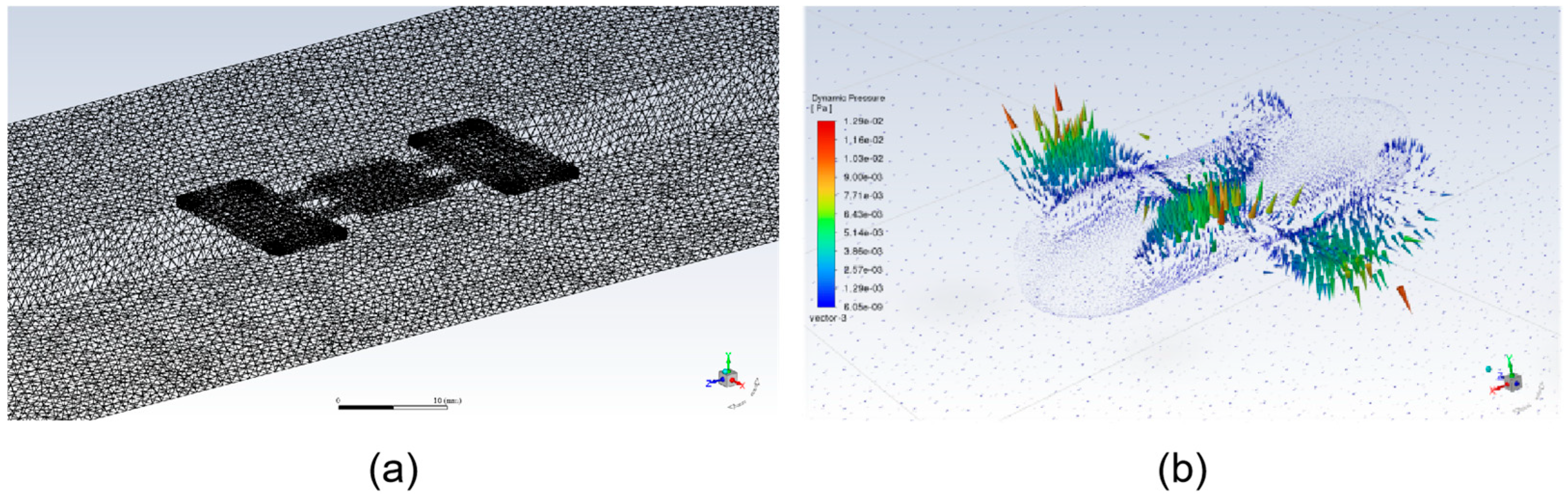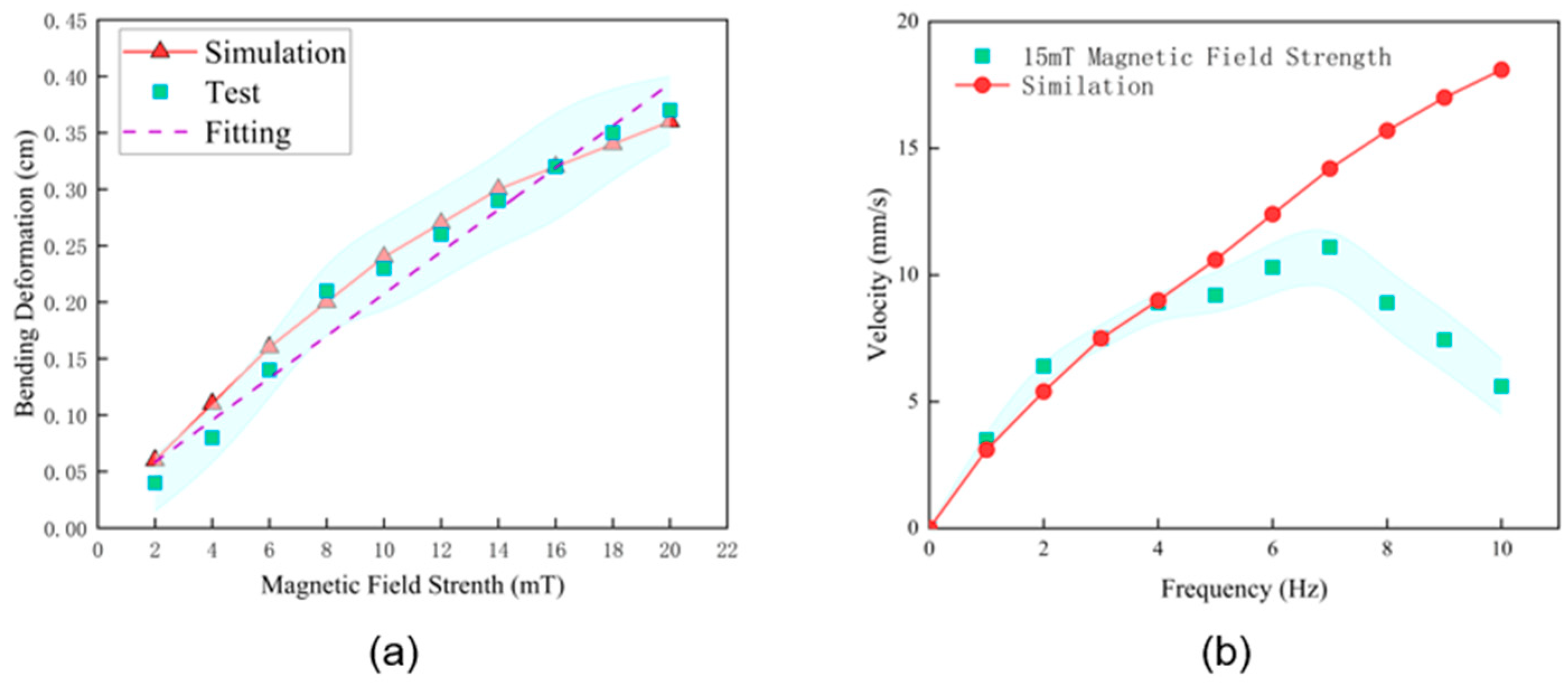 Figure 5b). Experimentally, the results exhibit a distinct non-monotonic trend, which contrasts with the linearly increasing prediction from the numerical simulation. In the low-frequency regime (0–7 Hz), velocity rises steadily with frequency, peaking at a maximum of 11.1 mm/s at 7 Hz, thus marking 7 Hz as the optimal operating point. The systematic overestimation in the simulation results likely stems from the model’s idealized linear elastic assumptions, which do not fully account for the complex fluid drag and internal structural damping present in the physical prototype.